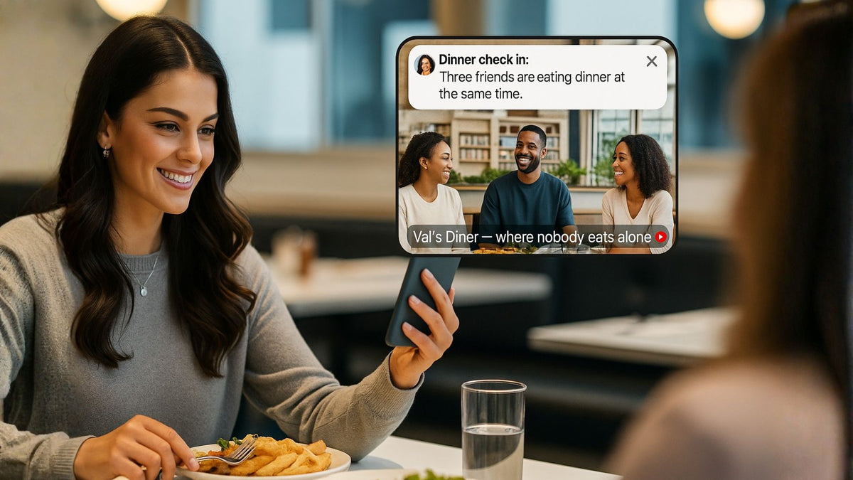 Val's Diner™ is an interactive app that brings people together through shared meals, live video, and heartfelt connection. Tap your phone with NFC to instantly connect with a Dinner Twin™ anywhere in the world, or start a cozy chat with Miss Know It All AI—because nobody should eat alone.