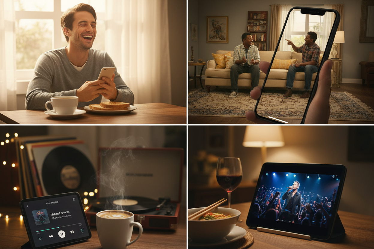 Join scheduled group meals like Dinner at 6 or Lunch at Noon, match with someone for a private one-on-one meal, or drop in anytime for conversation and comfort. We blend food culture, original music, and storytelling into every experience—with original skits, soulful recipes, live chats, and late-night check-ins.